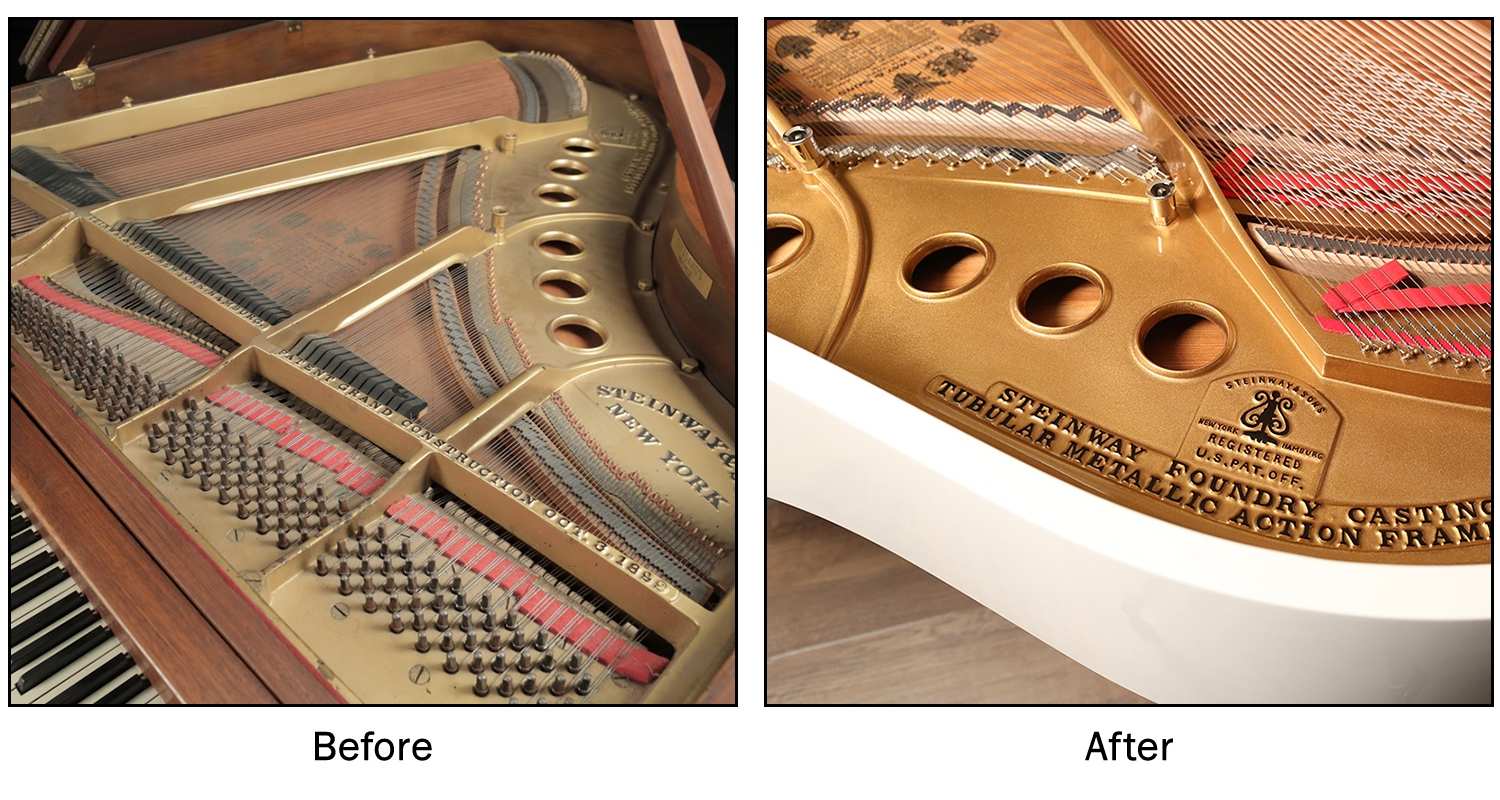 Although it can be hard to pinpoint, the additional years of life that a piano gains from being restored to the near- new condition can range between 50 and 70 years. The “life” of a piano is defined as the overall condition of sound quality, interior and exterior elements that influence its playability. That said, the life of a piano is relative to its use, but adding 50-70 years of playability and beauty is a worthwhile investment to keep a valuable, handmade piano alive. Additionally, a new piano drops in value like a brand new car would. Restored pianos hold their value longer than brand new pianos.