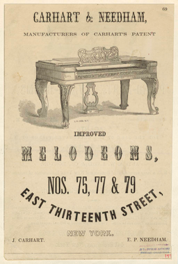 The Carhart & Needham company, founded in New York in 1851, produced organs and melodeons (of the organ variety). [1] For those unfamiliar, a melodeon is a small, reed organ that was very popular beginning in the 1840’s.