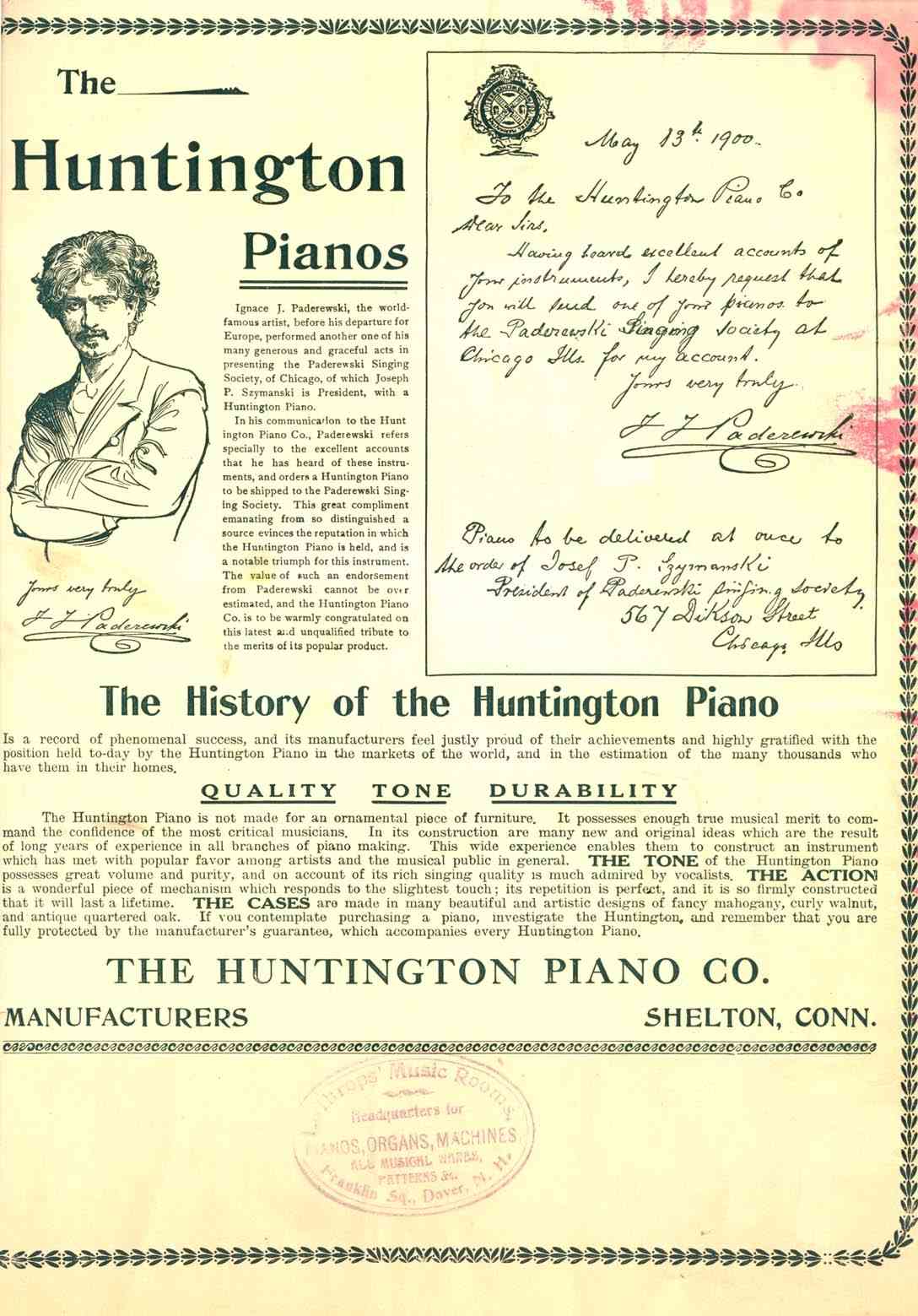 Huntington manufactured pianos and player pianos, both electrically and manually operated. [2] They built several models of uprights, player pianos and baby grand pianos until the Great Depression era, and in the 1930’s, Huntington introduced a line of small console and spinet pianos as well as a line of small baby grand pianos.