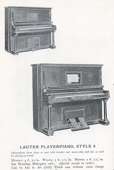 Lauter Piano Company made their own grands, upright grands, and player pianos marketed with the brand names Lenox, Llewellyn, and Lauter-Humana. Those familiar with Lauter pianos claim that they were built with fine quality materials, both cosmetically and structurally. The evidence of the quality of instrument can be seen and heard after decades, upon observing the pearl-white ivory keys, the excellent veneer finish, and a full-bodied powerful sound.