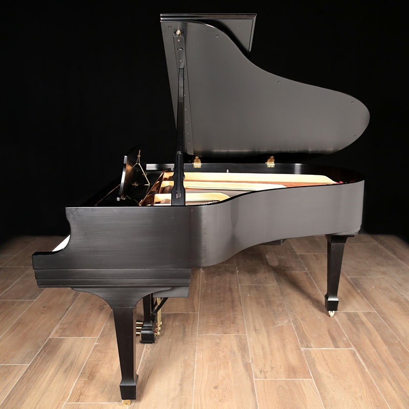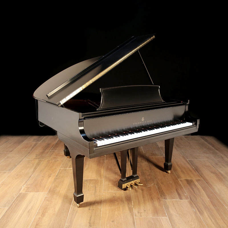 This Steinway Model M is in classic satin ebony and has a traditional case. Includes a matching bench.
